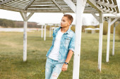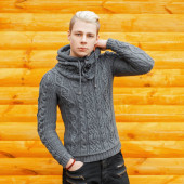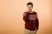 Man in a knitted warm sweater with Christmas patterns and hat standing near red brick wall