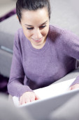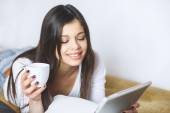 ładna dziewczyna uśmiecha się laptop z filiżanką kawy w ręku