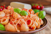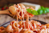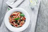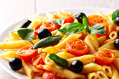 makaron z sosem pomidorowym oliwki i kapary