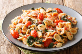 Arrabiata makaron penne z parmezanem. pionowe widok z góry
