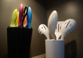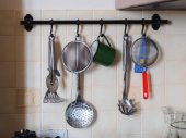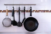 Naczynia kuchenne wiszące na ścianie kolorowe płytki
