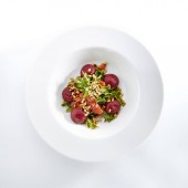 Sałatka z kurczaka wątroby i szpinak w widoku z góry białe płytki