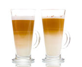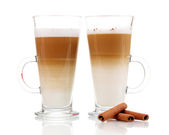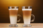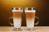 Pachnące? Unduli latte w szklanych filiżanek na drewniany stół na brązowym tle