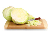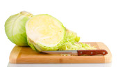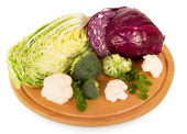 Cabbages and broccoli on wooden chopping board isolated on white