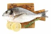 świeże ryby z cytryny, natki pietruszki i przyprawy na deski do krojenia drewniana na białym tle