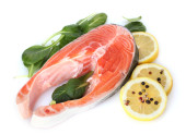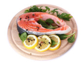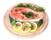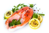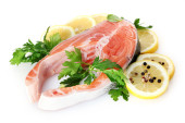 czerwona ryba z cytryna, pietruszka, pieprz, na białym tle