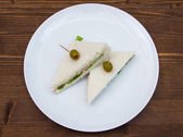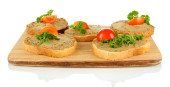 smaczne kanapki z szproty na tabliczce na drewnianym stole na brązowym tle
