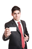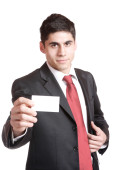 Młody biznesmen oferuje wizytówki na białym tle. (f