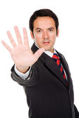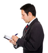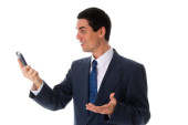 szczęśliwy biznesmen czytanie sms na telefon przed biały