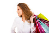 uśmiechnięta młoda kobieta przenoszenia torby na zakupy i prezenty na biały ba