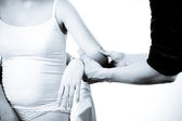 kobieta w ciąży robi ćwiczenia gimnastyczne na szarym tle.