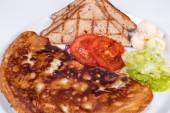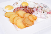 Śniadanie angielskie z jajecznica, pomidory, ziemniaki, tosty i świeże sałatki