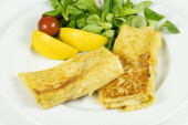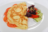 Śniadanie angielskie z jajecznica, pomidory, ziemniaki, tosty i świeże sałatki