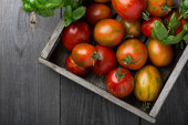 Warzywa w kosz: pomidory. Żywności, Martwa natura.