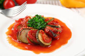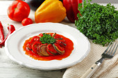 Zdjęcie "Ratatuj na talerzu, na tle tabeli" może być wykorzystywane do celów osobistych i komercyjnych zgodnie z warunkami zakupionej licencji Royalty-free. Obraz jest dostępny do pobrania w jakości wysokiej rozdzielczości do 5760x3840.