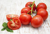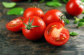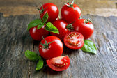 Pomidory wiśniowe z bazylią na drewnianym stole z bliska