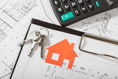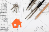 Nieruchomości Concept Paper modelu domu z kluczami przed białym niebieskim nadrukiem. Budynek ekologiczny. Widok z góry.