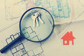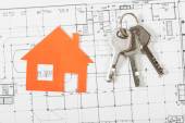 Nieruchomości Concept Paper modelu domu z kluczami przed białym niebieskim nadrukiem. Budynek ekologiczny. Widok z góry.