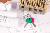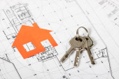 Zdjęcie "Nieruchomości Concept Paper modelu domu z kluczami przed białym niebieskim nadrukiem. Budynek ekologiczny. Widok z góry." może być wykorzystywane do celów osobistych i komercyjnych zgodnie z warunkami zakupionej licencji Royalty-free. Obraz jest dostępny do pobrania w jakości wysokiej rozdzielczości do 5760x3840.