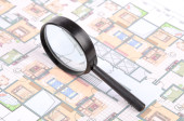 Real Estate Concept Paper model house against white blue print background. Ecological building. Top view.