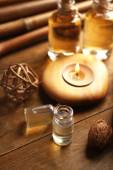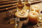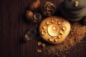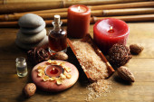 Skład zdobione świece i kamyki na mat bambusowych, z bliska