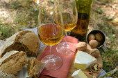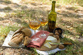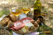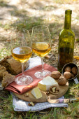 Piękna kompozycja białego wina, sery, orzechy i chleb na terenie parku