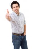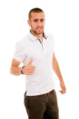 pokazano szczęśliwy młody człowiek dorywczo kciuk i uśmiechnięty, na tle