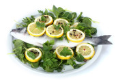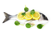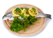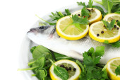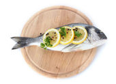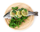 świeże ryby z cytryna, pietruszka, pieprz na deski do krojenia drewniana na białym tle