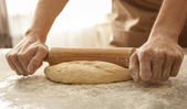 Ręce toczenia ciasta na pizzę na drewnianym stole, zbliżenie
