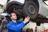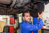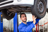 Młody atrakcyjny mechanik praca na samochód w garażu