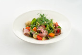 Wędzona szynka i rukola sałatka na płytce białe poziome