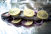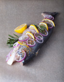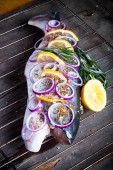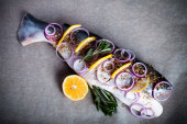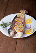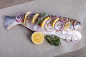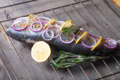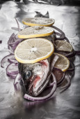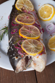 Ryby Nelma cytryny, cebula i rozmarynem na drewnianym stole. Tona