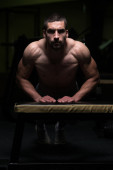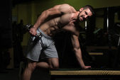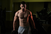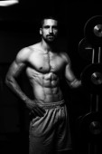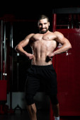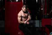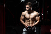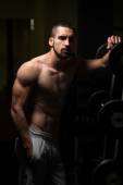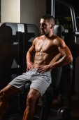 Muskularny mężczyzna wyginanie mięśni w ciemnej sali gimnastycznej