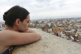 Classy attractive brunette wearing black white dress in urban environment leaning on surface and enjoying a view while looking thoughtful