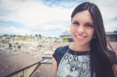 Classy attractive brunette wearing black white dress in urban environment leaning on surface and enjoying a view while smiling