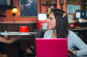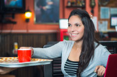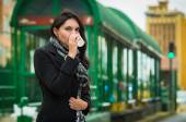 Brunette model wearing black jacket and grey scarf waiting for public transportation acting cold at station with cup of coffee