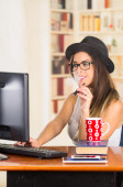 Atrakcyjny brunetka sobie sweter szary siedział przy stole restauracji pracuje z różowego laptopa i trzymając kubek kawy czerwony blisko ujścia