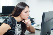 Zdjęcie "Atrakcyjny brunetka sobie sweter szary siedział przy stole restauracji pracuje z różowego laptopa i trzymając kubek kawy czerwony blisko ujścia" może być wykorzystywane do celów osobistych i komercyjnych zgodnie z warunkami zakupionej licencji Royalty-free. Obraz jest dostępny do pobrania w jakości wysokiej rozdzielczości do 5760x3840.