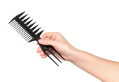 Czarny profesjonalny grzebień w ręce kobiece kobieta na białym tle
