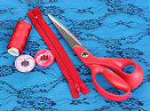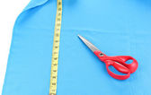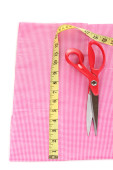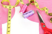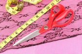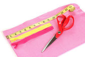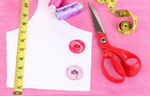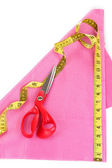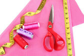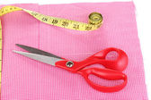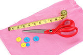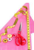 nożyczki, nici, taśmy pomiarowe i wzór na tkaninie na białym tle