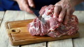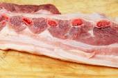 surowy wieprzowina i nóż na drewnianą deską do krojenia.