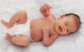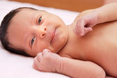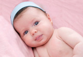 Piękne dziecko dziewczynka z otwartymi oczami, leżąc na kanapie