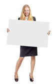 szczęśliwy uśmiechający się kobieta młody biznes pokazano szyld puste, na białym tle nad białym