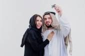 Połowa ciała arabski para pozowanie razem na białym tle na szarym tle.