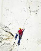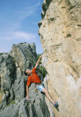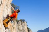 Młody mężczyzna wspinaczka wiszący na urwisku.