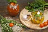 Sos pomidorowy (dżem) w szklanym słoju z natką pietruszki i świeże pomidory na ciemny drewniany stół, selektywne focus.
