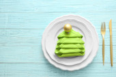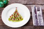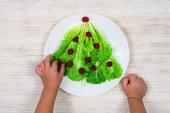Kobieta co choinki jodła wykonane z kiwi na starym drewnianym stole