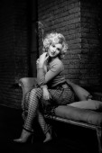 Young beautiful short hair blonde woman in turtle neck tight short dress sitting on stairs, black and white photo. Romantic mysterious lady with movie star retro look posing, bricks wall background.