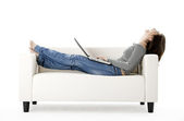 młoda kobieta siedziała na krześle z laptopa i telefon komórkowy