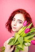 Piękna młoda kobieta z tulipany (skupić się na talips)